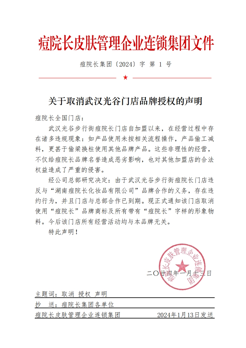 > 关于取消武汉光谷门店品牌授权的声明